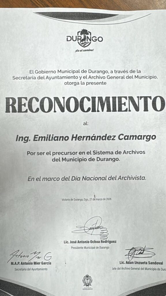 El 27 de marzo en el marco del Día Nacional del Archivista, el Gobierno Municipal que preside el Lic. Antonio Ochoa García, por conducto del Secretario del Ayuntamiento, MAP Antonio Mier García, entregó nombramientos a los responsables de 31 dependencias y organismos que integran el Comité Municipal de Archivos. Estos tienen el carácter de coordinadores que funciona en los términos de lo dispuesto en el REGLAMENTO DEL SISTEMA DE ARCHIVOS DEL MUNICIPIO DE DURANGO, aprobado en 2007, en la gestión del Presidente Municipal Jorge Herrera Delgado, (2004-2007), con quien colaboré como Secretario Municipal y del Ayuntamiento.